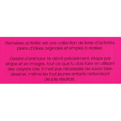 Premières activités est une collection de livres d'activités, pleins d'idées originales et simples à réaliser. Dessins d'animaux te décrit précisément, étape par étape et en images, tout ce que tu dois faire en utilisant des crayons cire. Il n'est pas nécessaire de savoir bien dessiner, même les tout jeunes enfants obtiendront de jolis résultats.