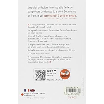 Un roman jeunesse qui passe petit à petit en anglais. La collection Tip Tongue révolutionne l'apprentissage des langues étrangères et renouvelle le roman bilingue ! Version intégrale audio téléchargeable gratuitement.Sur le Ferry qui l'emmène avec son jeune frère Hugo en Irlande, Hannah dérobe une peluche en forme de Leprechaun, le célèbre petit lutin irlandais. Elle va très vite comprendre que le lutin possède des pouvoirs magiques... Et qu'il a un caractère épouvantable ! Niveau A1 Découverte du CECRL (" Je découvre l'anglais " / Dès le CM2 - 6è - 5è) Tip Tongue, ce sont avant tout de vraies, de bonnes, de chouettes histoires, écrites par des auteurs de littérature jeunesse anglophones, hispanophones ou germanophones, qui utilisent une langue authentique. Les romans passent petit à petit en anglais, en espagnol ou en allemand, de manière progressive et naturelle, et le dernier chapitre est intégralement dans la langue-cible. Chaque histoire fait vivre au lecteur un véritable voyage linguistique, en immersion. Plaisir de lecture immense et fierté de comprendre une langue étrangère, tous les ingrédients d'une pédagogie positive sont au rendez-vous ! Tip Tongue a obtenu le Label européen des langues, récompensant des projets pédagogiques d'excellence en matière d'apprentissage et d'enseignement innovants des langues étrangères.