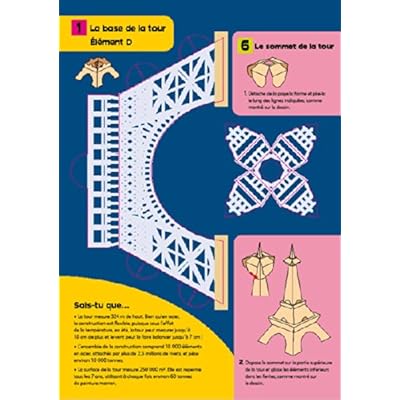 Avec ce livret, les petits amateurs de pliages réalisent un magnifique modèle de 41 centimètres de la plus belle tour du monde, tout en découvrant l'histoire de ce monument emblématique de Paris, connu dans le monde entier. L'enfant, dès 4 ans, peut construire seul ce monument de l'architecture sans colle ni ciseaux, à partir d'éléments prédécoupés. Des exemples, des instructions et des lignes de pliage lui indiquent comment plier et fixer les éléments en papier cartonné.