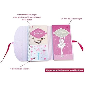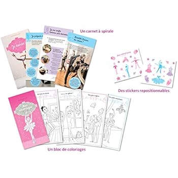 Une pochette de danseuse élégante pour entrer dans la peau d'un vrai petit rat: le rêve de toutes les filles dès 6 ans ! Un carnet à spirale de 12 double-pages avec photos : Je prépare ma tenue de danseuse, Mes chaussons, Je me coiffe comme une danseuse, Les cinq positions, Les exercices à la barre, Le studio de danse, Les portés et pas de deux, Mon emploi du temps, Les grands ballets emblématiques... Un bloc de 32 coloriages représentant des scènes de vie quotidienne à l'école de l'Opéra, des costumes, des pas de danse, ou encore des accessoires. Des stickers repositionnables