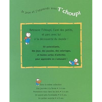 Au travers de jeux (observations, coloriages, comptage ), les petits suivent T'choupi dans différents univers. Aujourd'hui T'choupi reçoit ses amis Pilou et Lalou. Au programme, déguisements et amusements tout l'après-midi